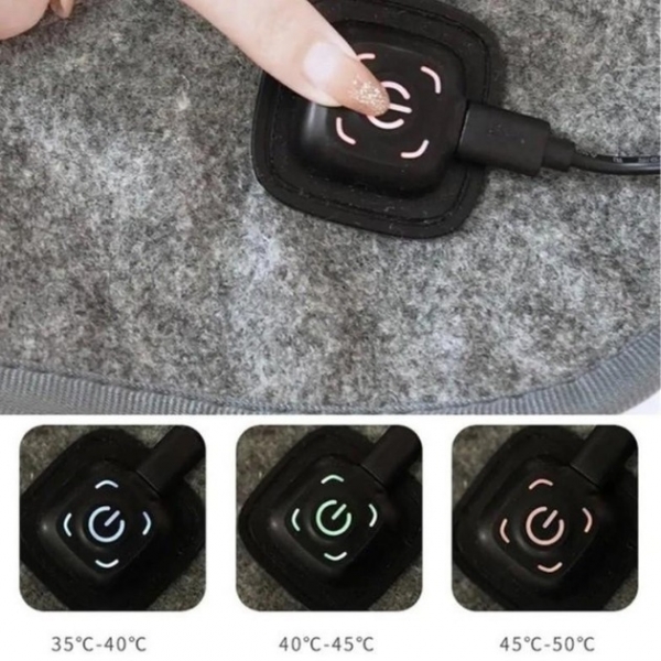 Три температурных режима с LED-индикацией: зелёный ≈35–40°C (≈1.2A), синий ≈40–50°C, красный ≈50–60°C (≈2A). Длительное нажатие ~5 с — включение/выключение, короткие — переключение режимов. С пауэрбанком 10 000 мА·ч автономность достигает до 8 часов в зелёном режиме и около 5 часов в красном.