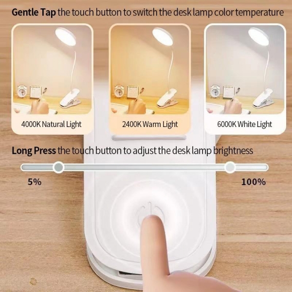Лампа имеет три режима освещения: холодный белый, теплый и нейтральный — вы можете подобрать нужный оттенок света для работы, чтения, отдыха или вечернего освещения. Благодаря сенсорному управлению можно легко менять яркость одним прикосновением: короткое нажатие переключает температуру света, а длительное — плавно регулирует интенсивность от 5 % до 100 %.